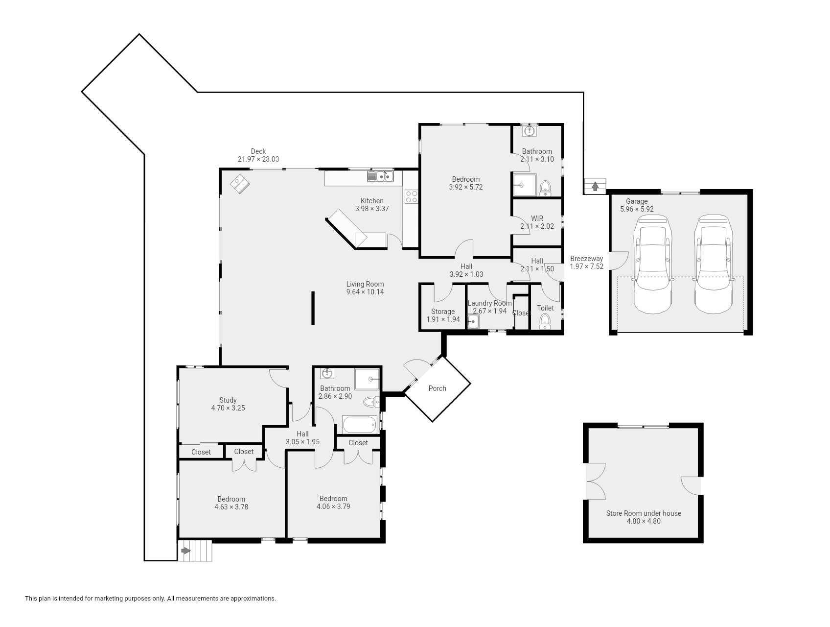 Offering up to four bedrooms and ensuite, but ideally suited to 3 bedrooms plus a large, office (study or library). The main bedroom has an ensuite bathroom and walk-in robe; the other bedrooms have built-in robes. The main bathroom includes a bath and shower. There is a double garage connected to the house via a breezeway and a sizeable workshop under the house.